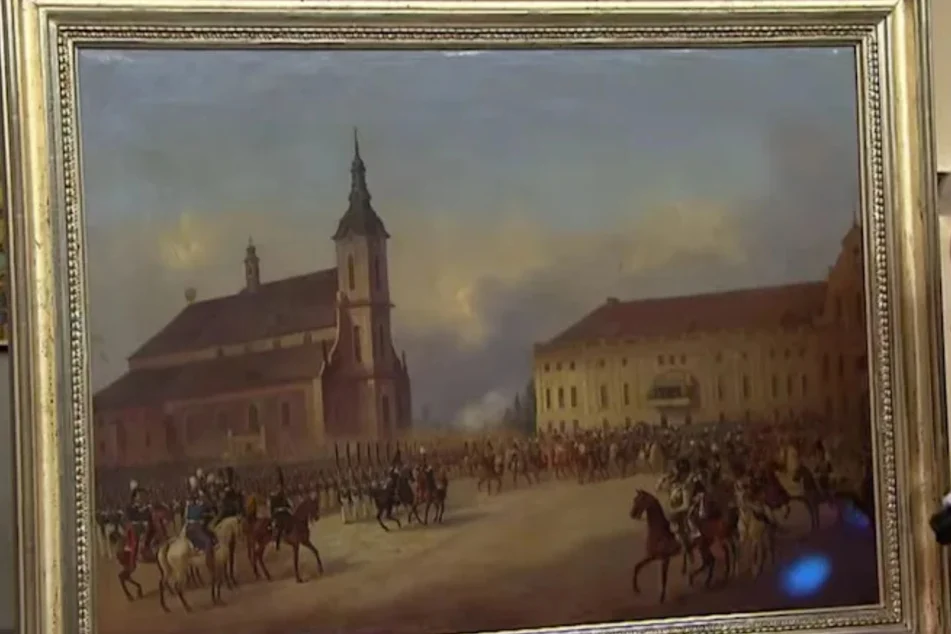 Abgebildet seien mehrere russische Soldaten, die auf einem Platz aufmarschiert sind. Problematisch sei jedoch, dass das Gemälde keine Signatur und keine Jahreszahl trage, weshalb die Zuordnung schwerfalle.