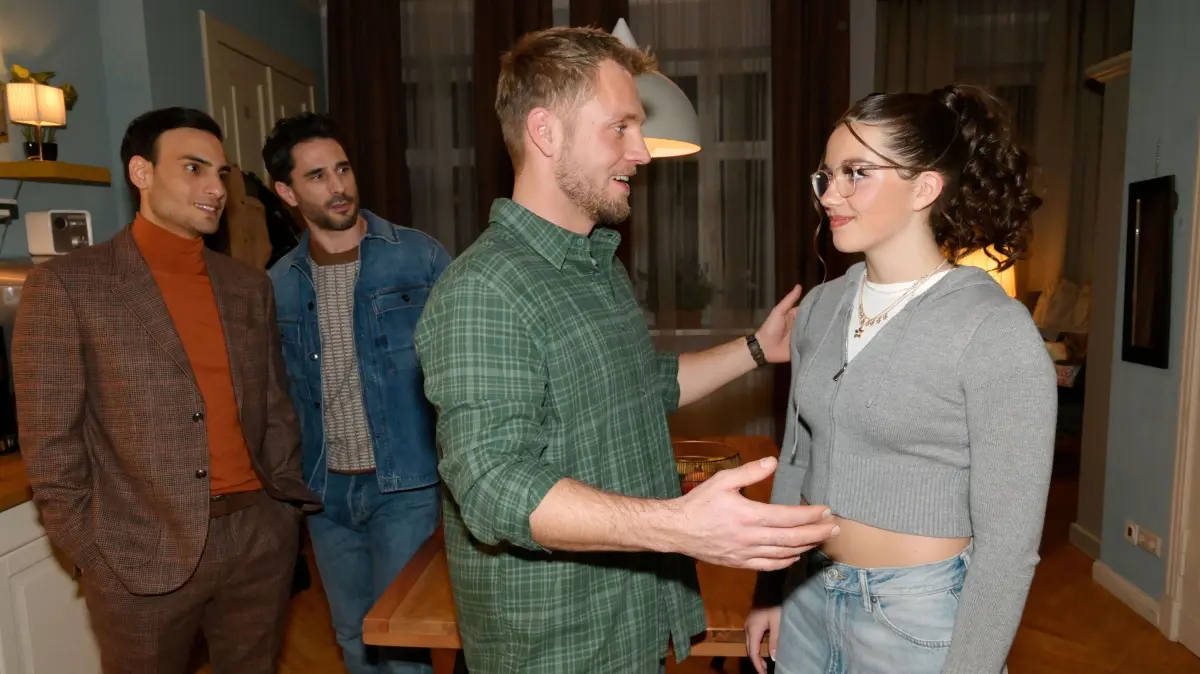Paul (Niklas Osterloh, 2.v.r.), Nihat (Timur Ülker, l.) und Tobias (Jan Kittmann) sind überrascht, als Kate (r.) verwandelt aus Australien zurückkommt.
